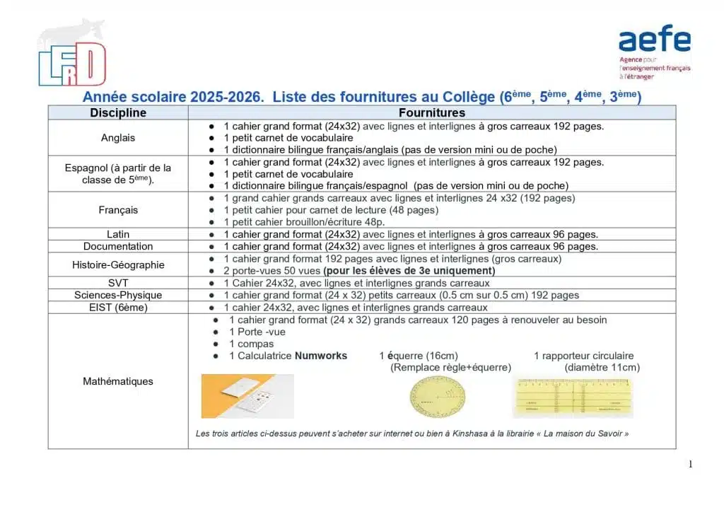 Fournitures (collège et lycée) - Lycée français René Descartes de Kinshasa